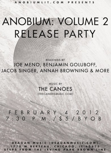 CHICAGO – On February 4, 2012, at 7:30 p.m. Anobium Books will be hosting a release party at Deagan Music (1770 W Berteau) to celebrate the Anobium: Volume 2, a new collection of literary and artistic esotera. Chicago-area writers Annah Browning, Benjamin Goluboff, Jacob Singer, Joe Meno and others will be reading at the event, followed by a performance from dirty-blues-style garage-rockers, The Canoes. This is a BYOB, 21+ event with a suggested $5 donation at the door.