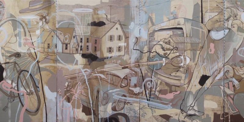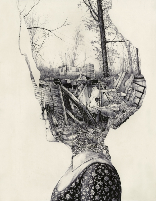 Two examples of works that show how Perry blends surreal and representational styles can be seen in “Outlived I” and “Outlived II.” While Perry loves the old guard of American Landscape painters, like Andrew Wyeth and Edward Hopper, he acknowledges that landscapes without people might be too simple, quiet, and subtle for audiences that are used to looking at hundreds of images a day online. “So how do I make a landscape not quiet? I reverse the figure and the foreground. At the bottom of each of his paintings are the shoulders of a figure, hinting at a traditional portrait, but heads seem to be covered in some sort of liquid, which can be noted if one looks at the noses and mouths. Whatever covers their heads opens up to a landscape of an abandoned scene set in rural America—trailers, electric lines, bricks, broken wooden walls, trees with a sparse amount of leaves, and a broken tractor. These landscapes don’t exist neatly in a rectangle frame, but Perry consciously leaves white space on the canvas.