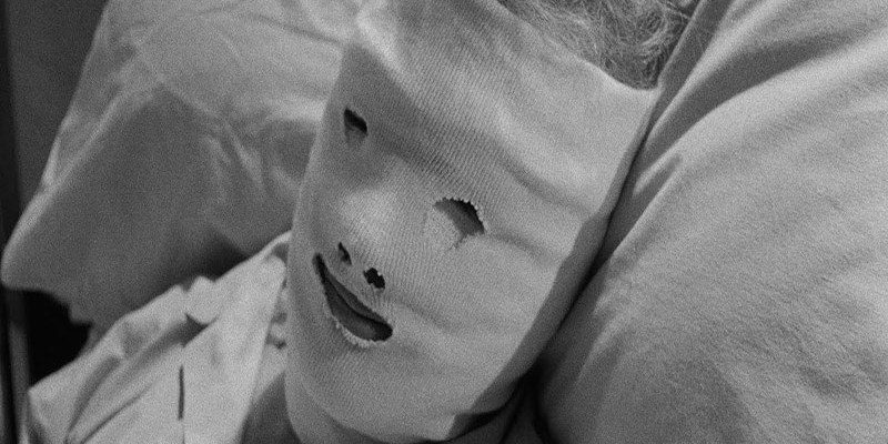 Hudson’s new visage, carved fresh and concealed under bandages, is startling in its blankness. The imagery here is reminiscent of other famous masks in cinema, including those found in Georges Franju’s Eyes Without a Face or Hiroshi Teshigahara’s The Face of Another. Unlike those movies, however, the mask conceals Rock Hudson, certainly not a marauder or ghoul. The shots hold a strange foreignness, Hudson’s transformation from bandaged freak to chiseled heartthrob comes in a fury of gauze, pencil marks, mirrors and salient double images. When the reveal comes, the end-product of surgery, you understand Hamilton’s shock